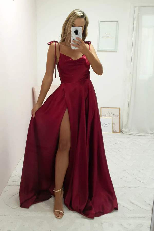 Dark Red Cowl Neckline Satin Long Prom Dress Simple Senior Prom Dress Y494