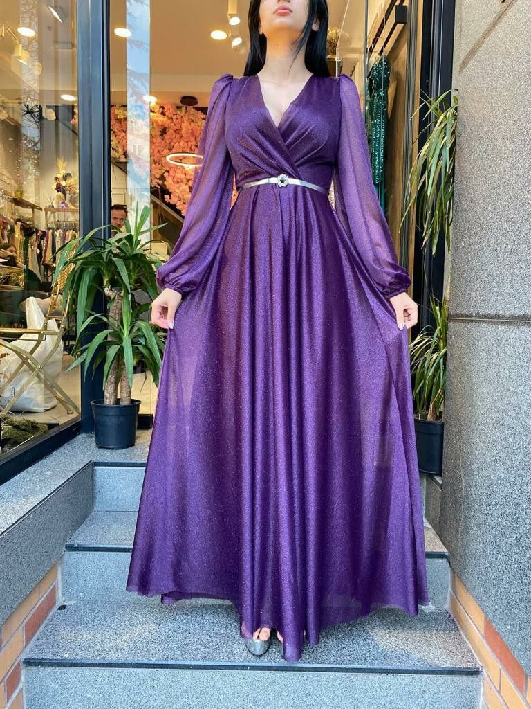 Elegant A Line V Neck Long Sleeve Purple Prom Dresses Y4977