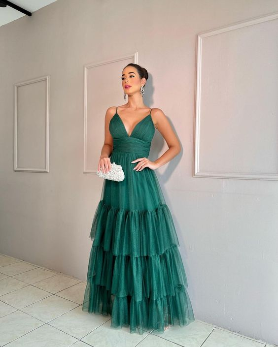 Elegant A-line V Neck Tulle Tiered Prom Dress,Formal Graduation Dresses Y5590