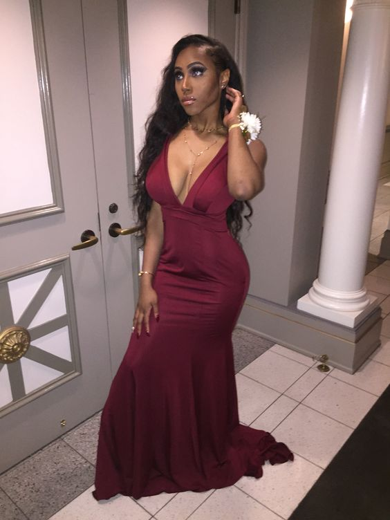 Elegant Burgundy Mermaid Evening Dress with V-neck Y6340