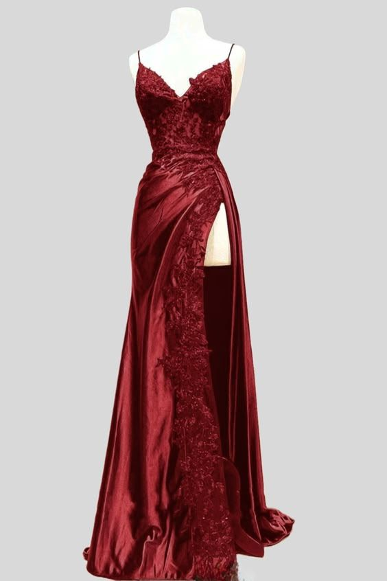 Elegant Burgundy Straps Appliques Mermaid Long Slit Slit Prom Dress Y7711