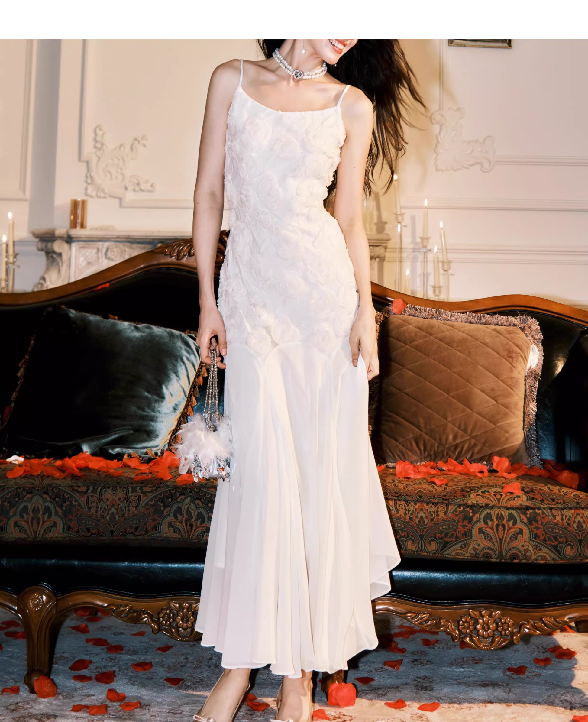 Fairy Spaghetti Straps 3D Rose Flowers Chiffon Mermaid Prom Dress White Birthday Party Dress SP1981