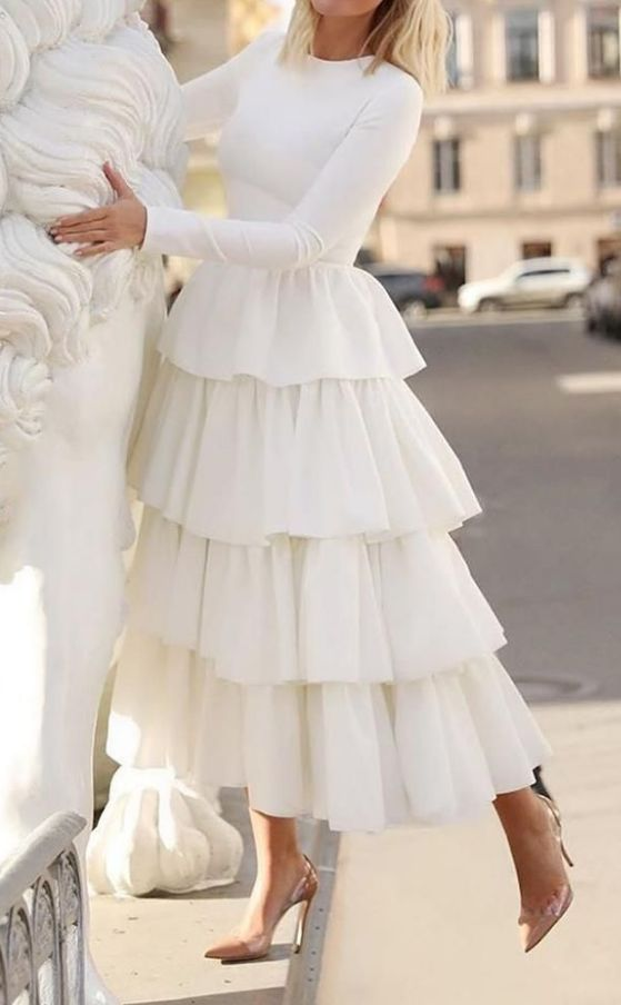 New Long Sleeve Prom Dress,Tiered Stretch Satin Tea Length Formal Dress,White Formal Party Dress Y6441