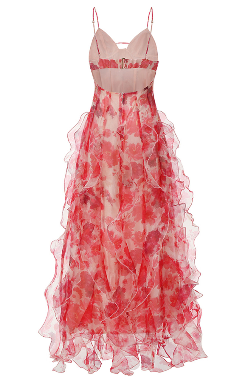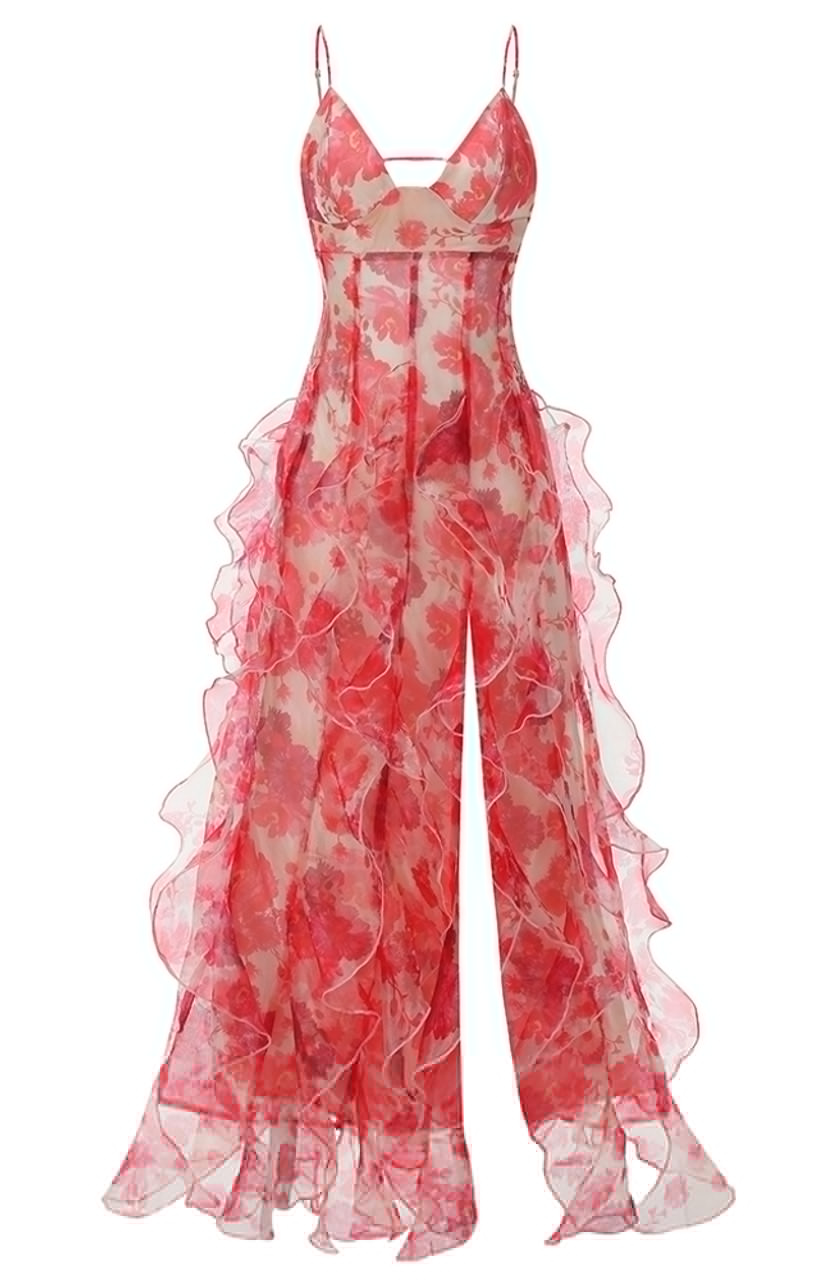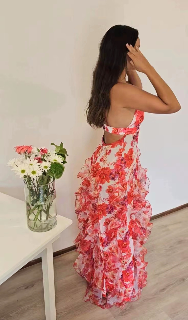Sexy Floral Ruffle Long Party Dress Red Backless Evening Dress Y8703