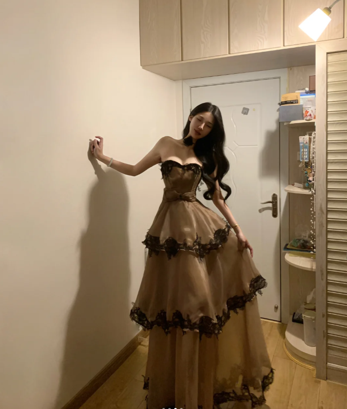 Vintage Strapless Tulle Appliques Layered A Line Long Party Dress Guest Dress SP295