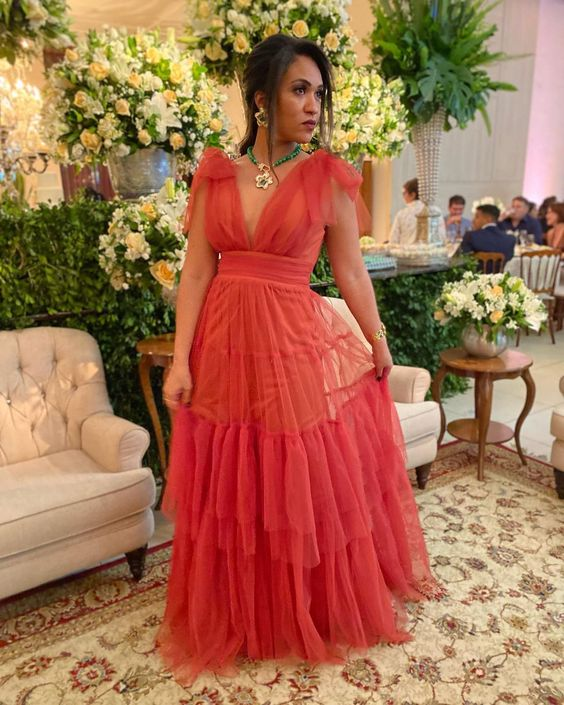 A-line V Neck Tulle Prom Dress,Wedding Guest Outfit Y5539