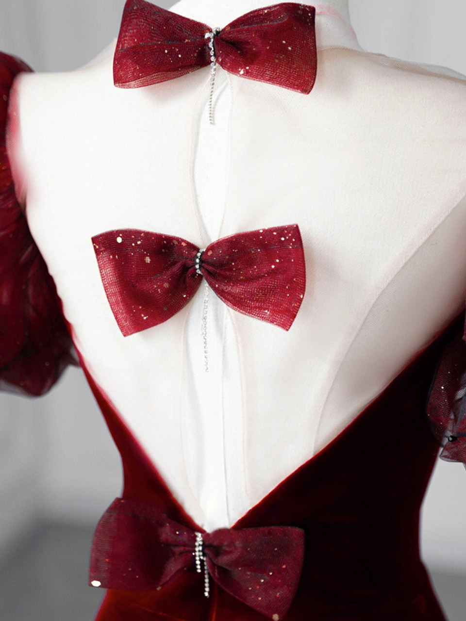 Burgundy Mermaid Velvet Puff Sleeve Bow Prom Dress Elegant Evening Dress Y7674