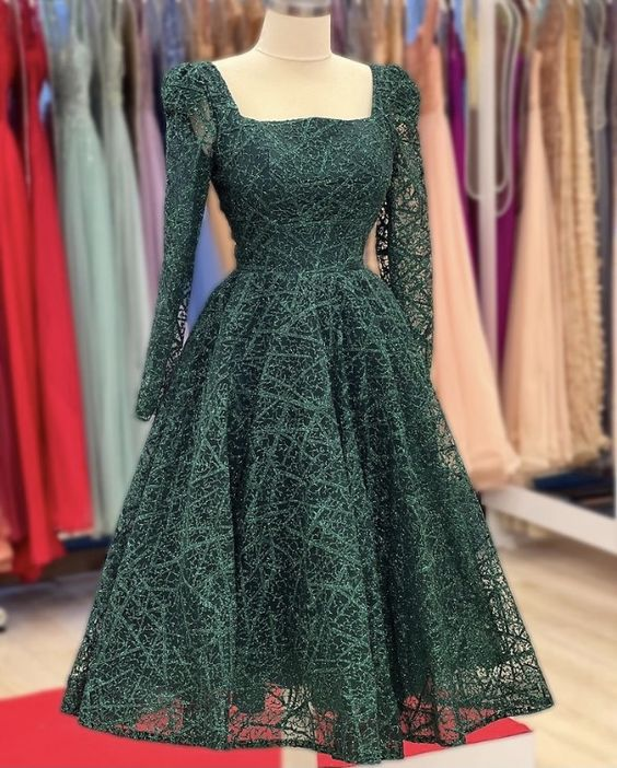 Chic Green Square Neck A-line Prom Dress,Green Party Gown Y6079