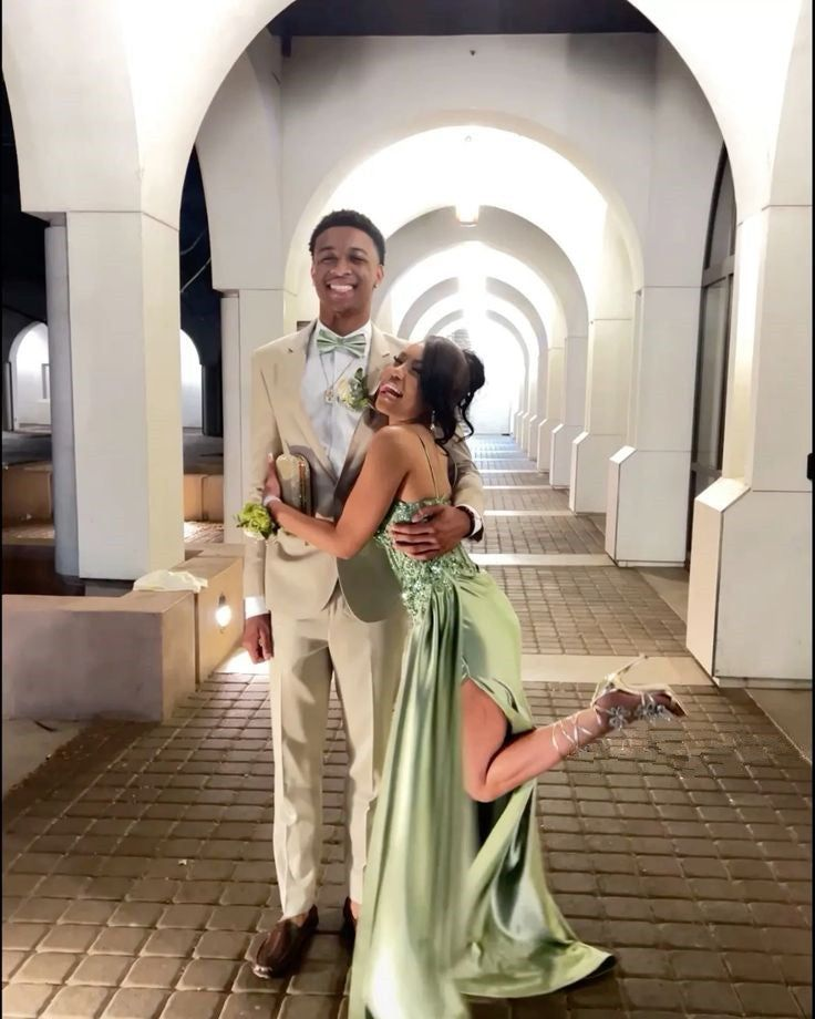 Classy Spaghetti Straps Satin Appliques High Slit Prom Evening Dress Y7722