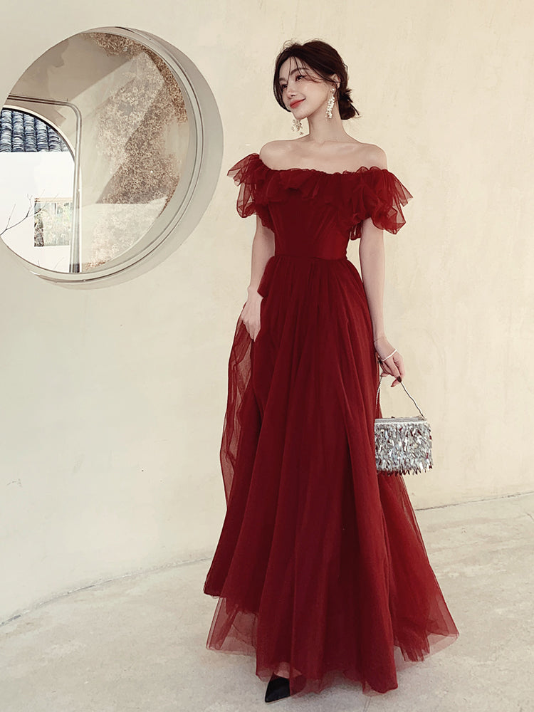 Dark Red Long Formal Gown, Off Shoulder Dark Red Prom Dress Y1653