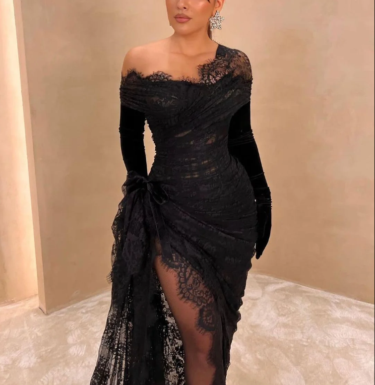Elegant Black Lace Prom Dress Asymmetric With High Slit Long Evening Dress Y7984