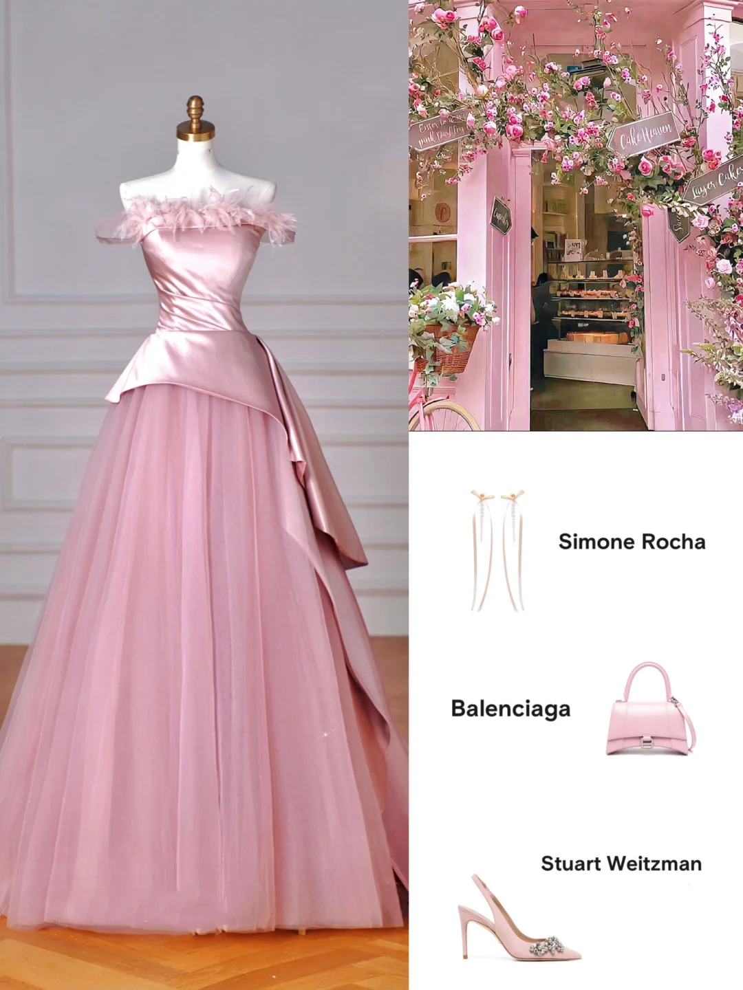Elegant Feathers Neck Strapless Tulle Satin Ball Gown,Pink A Line Prom Evening Dress Y8629