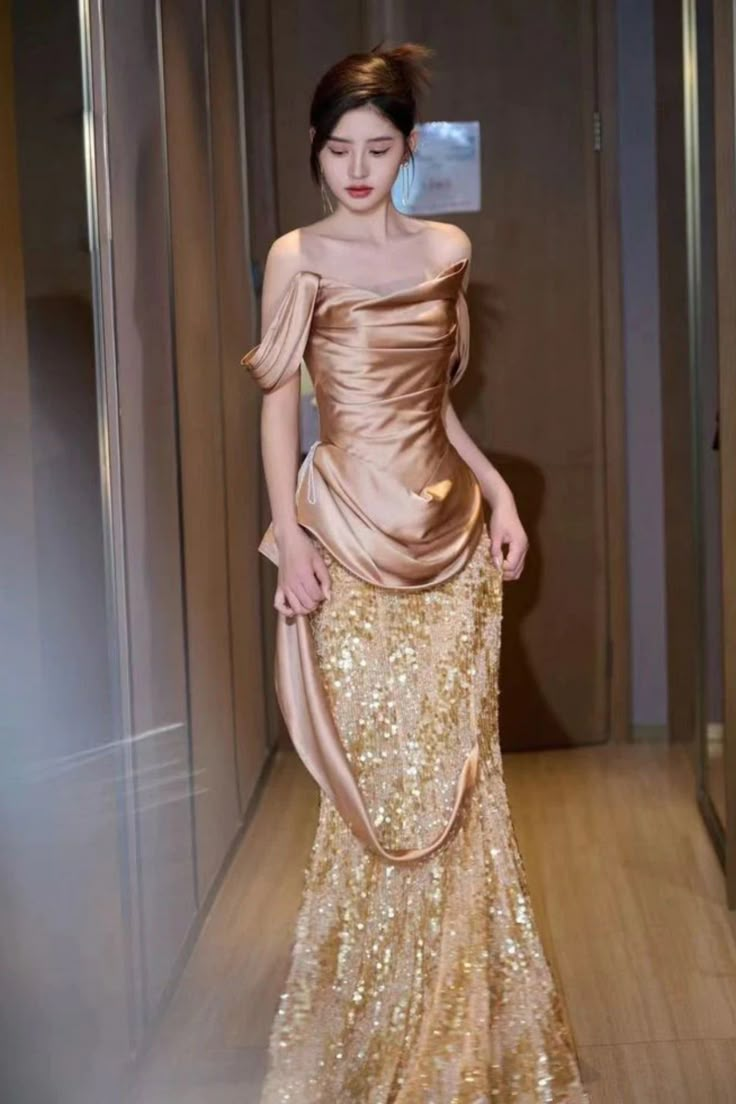 Elegant Gold Satin Sequin Strapless Mermaid Evening Dress Sparkly Prom Dress Y8716