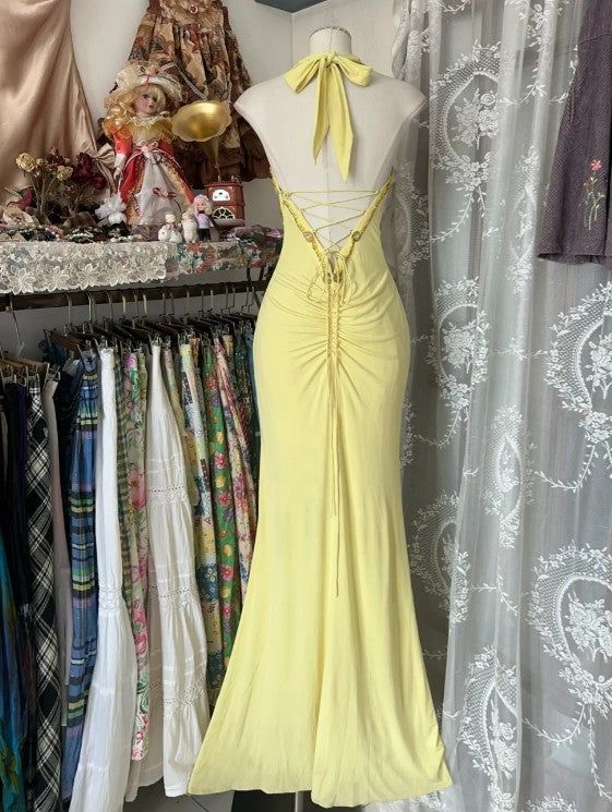 Elegant Yellow Mermaid Halter Neck Sequin Diamond Long Prom Dress,Backless Slit Evening Dress Y8554