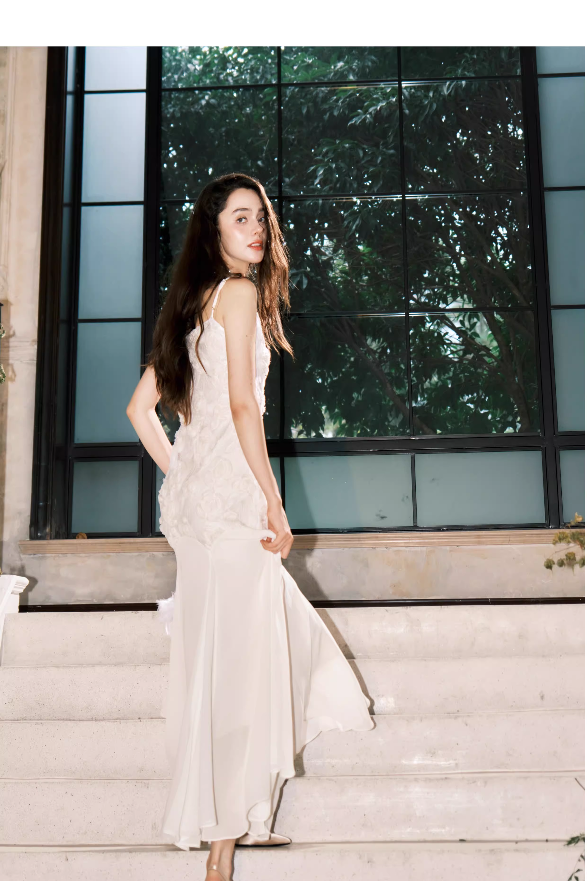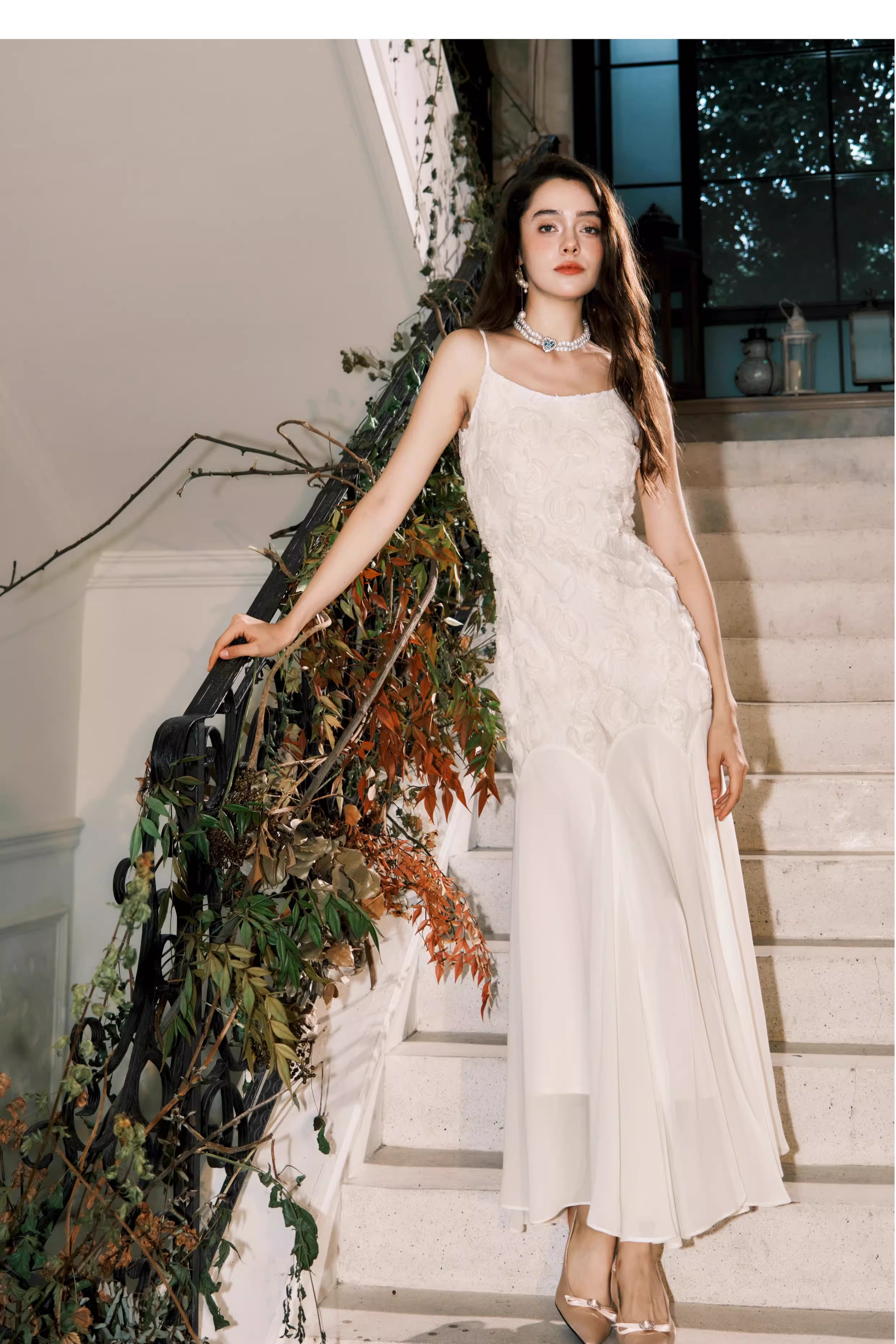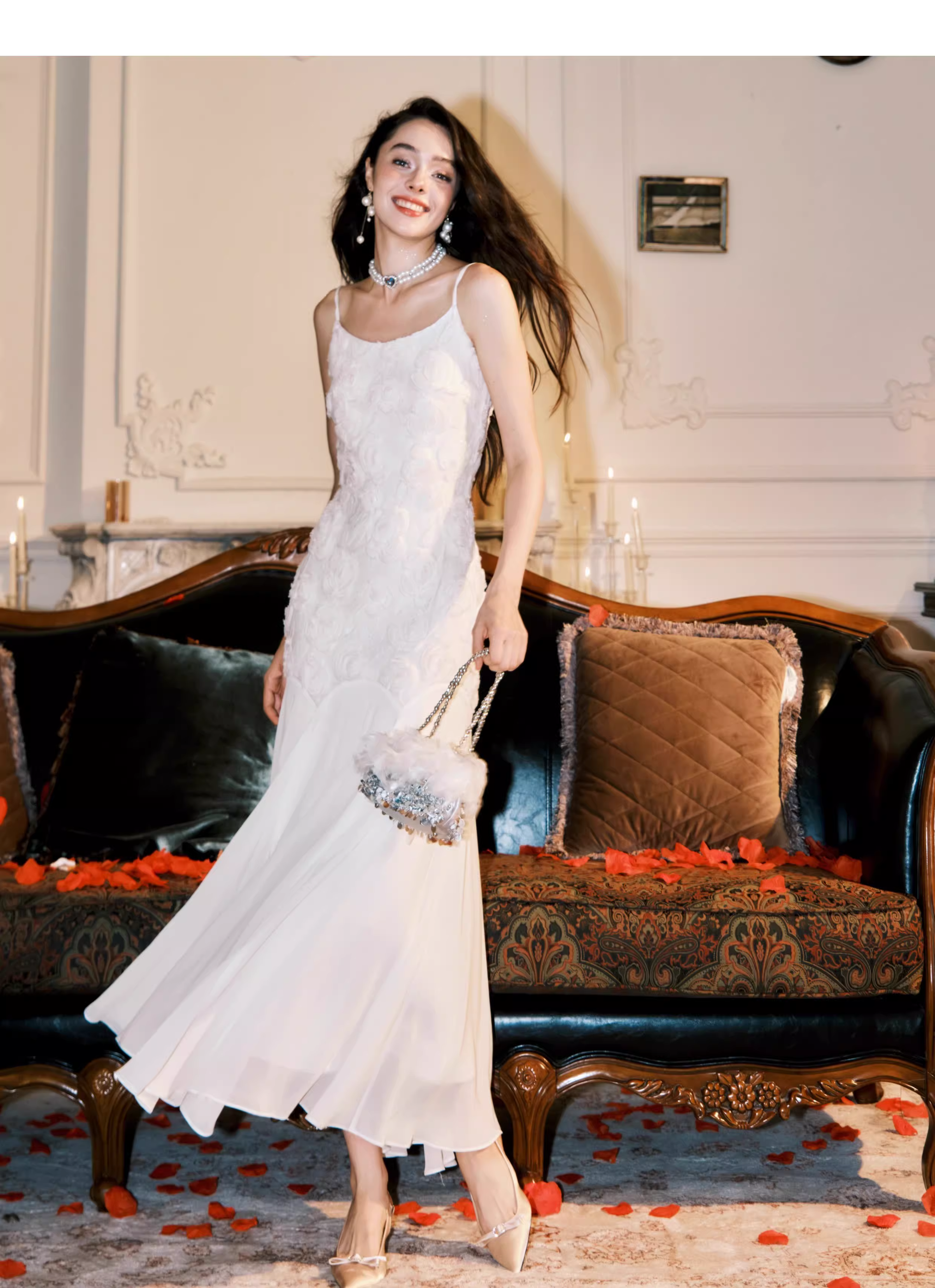 Fairy Spaghetti Straps 3D Rose Flowers Chiffon Mermaid Prom Dress White Birthday Party Dress SP1981