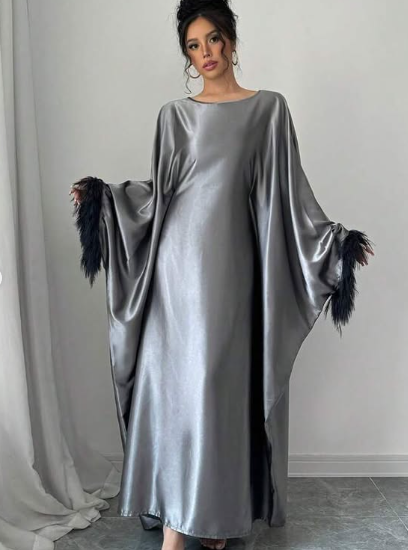 Fashion Satin Long Formal Evening Dress Long Sleeves Prom Dress With Feathers Y7571