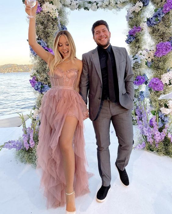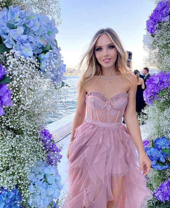 Formal Strapless Prom Dress For Women Tiered Tulle Lace Appliques Party Gowns Y6422