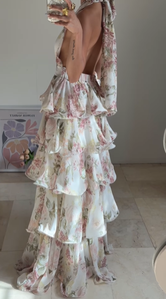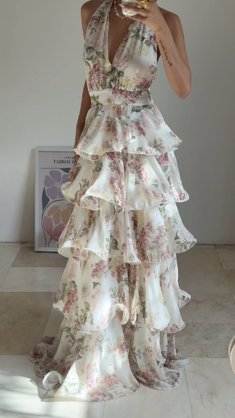 Glamorous Chiffon Print Floral A Line Backless Prom Dress,V Neck Halter Layered Evening Dress Y8501
