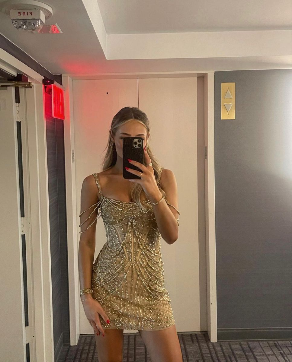 Gorgeous Gold Spaghetti Straps Sequin Beaded Sheath Cocktail Dress Formal Homecoming Dress Y9490