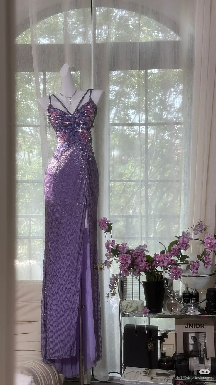 Gorgeous Lavender Chiffon Sequins Evening Dress Spaghetti Strap Slit Prom Dress Y8786