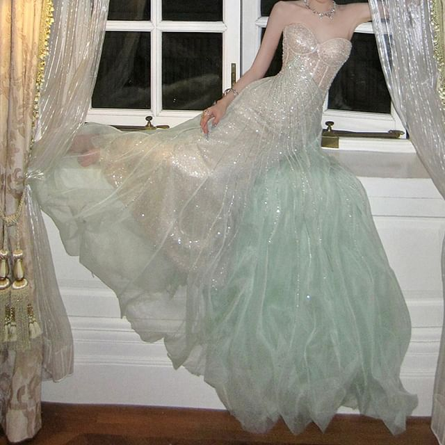 Gorgeous Strapless A Line Birthday Party Dress,Light Green Tulle Sequins Evening Dress Y8713