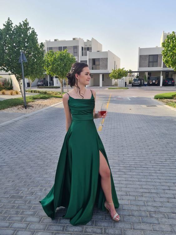 Green A line Prom Dresses Long Side Slit,Green Senior Prom Gown Y6304