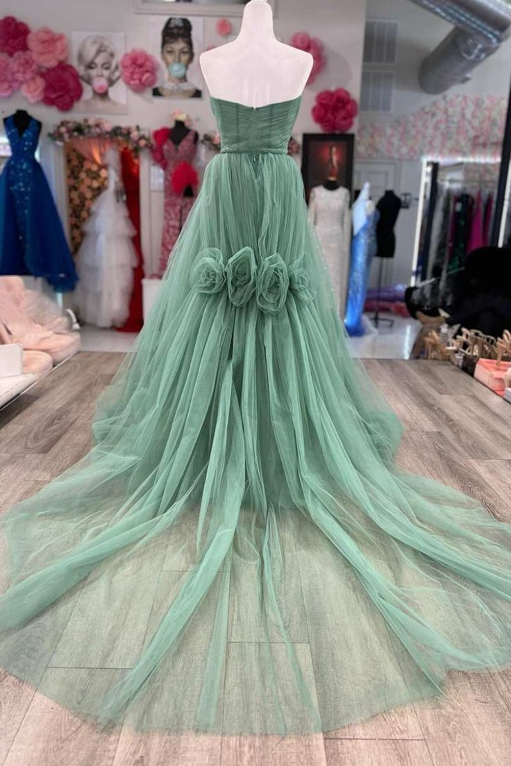 Green Strapless Floral Long Prom Dresses, Green Formal Dresses, Green Tulle Evening Dresses Y4640