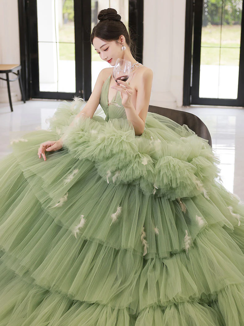 Green v neck tulle long prom dress, green tulle sweet 16 dress Y838