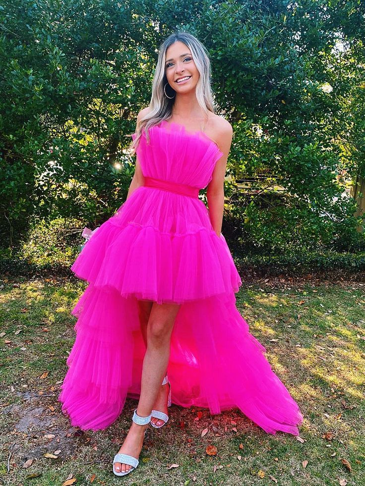 Hot Pink High Low Tulle Prom Dresses, Hot Pink High Low Formal Graduation Dresses Y5609