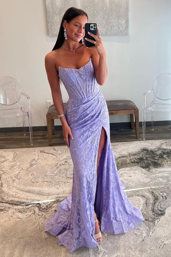 Lavender Strapless Lace Ruched Mermaid Prom Dress with Slit Y6709