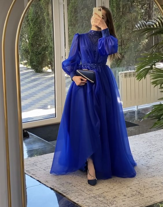 Modest Royal Blue A-line Tulle Prom Dress,Fashion Maxi Dress Y6968