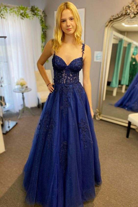 Navy Blue Appliques Sweetheart A-Line Long Prom Dress Y6449