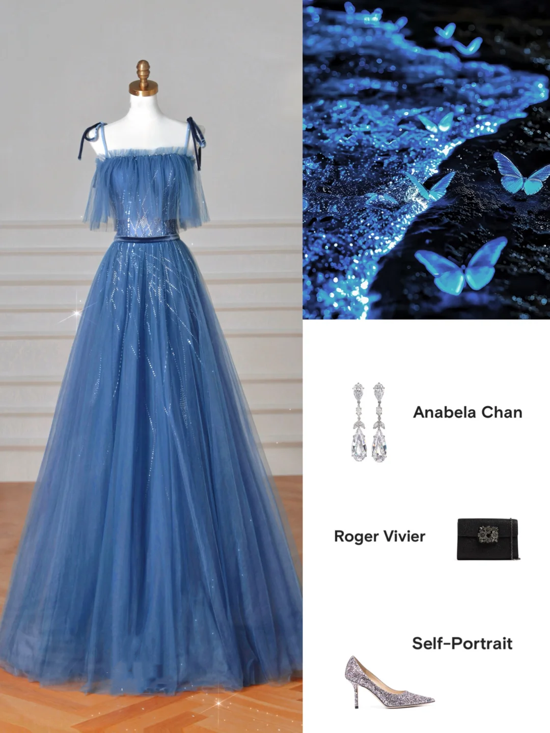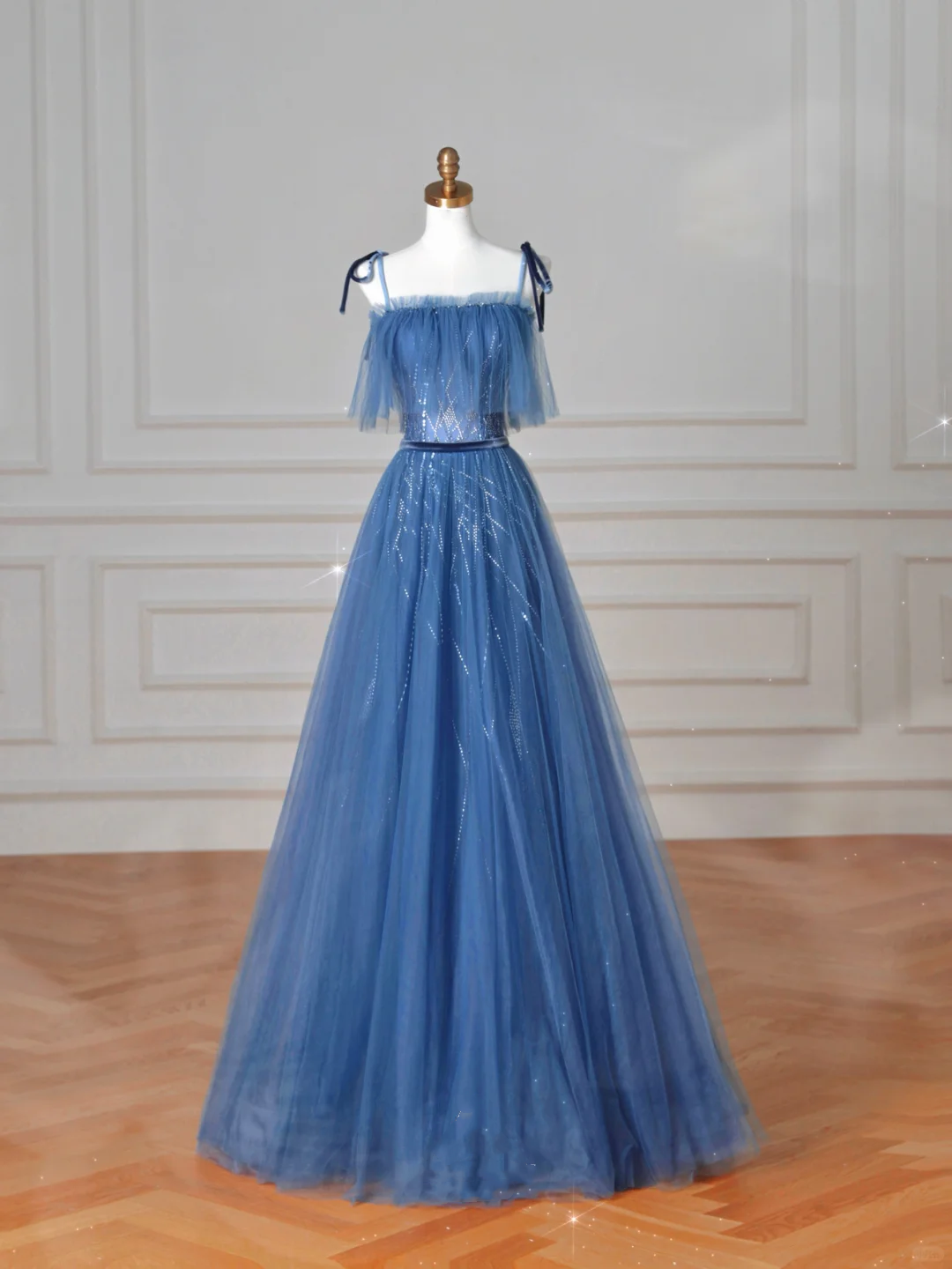 Pretty Blue Spaghetti Straps Tulle Sequins A Line Prom Dress Evening Dress Y8634
