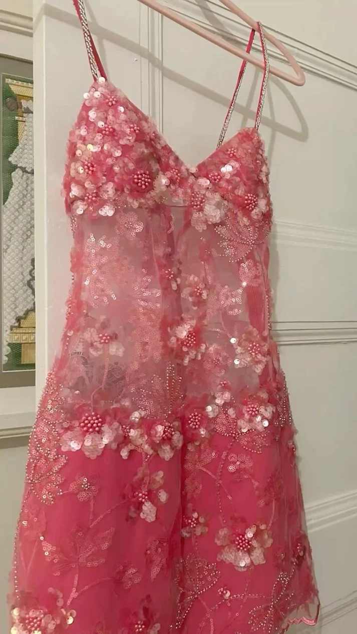 Pretty Spaghetti Straps Pink Sequin Short Birthday Outfits Formal Graduation Homecoming Dress Y9311