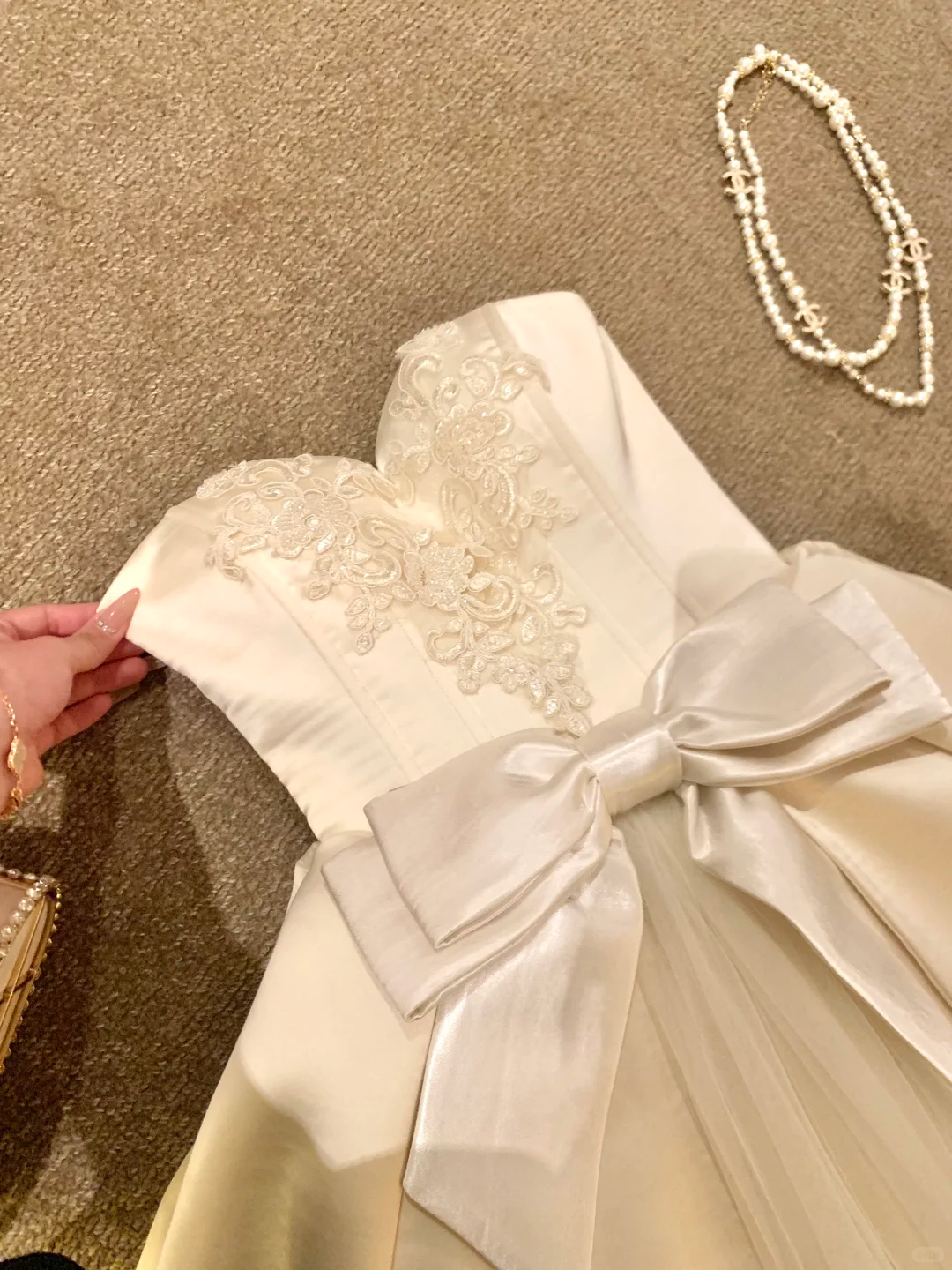 Pretty White Satin Tulle Appliques Short 20th Birthday Outfits Formal Homecoming Dress With Bow Y9406