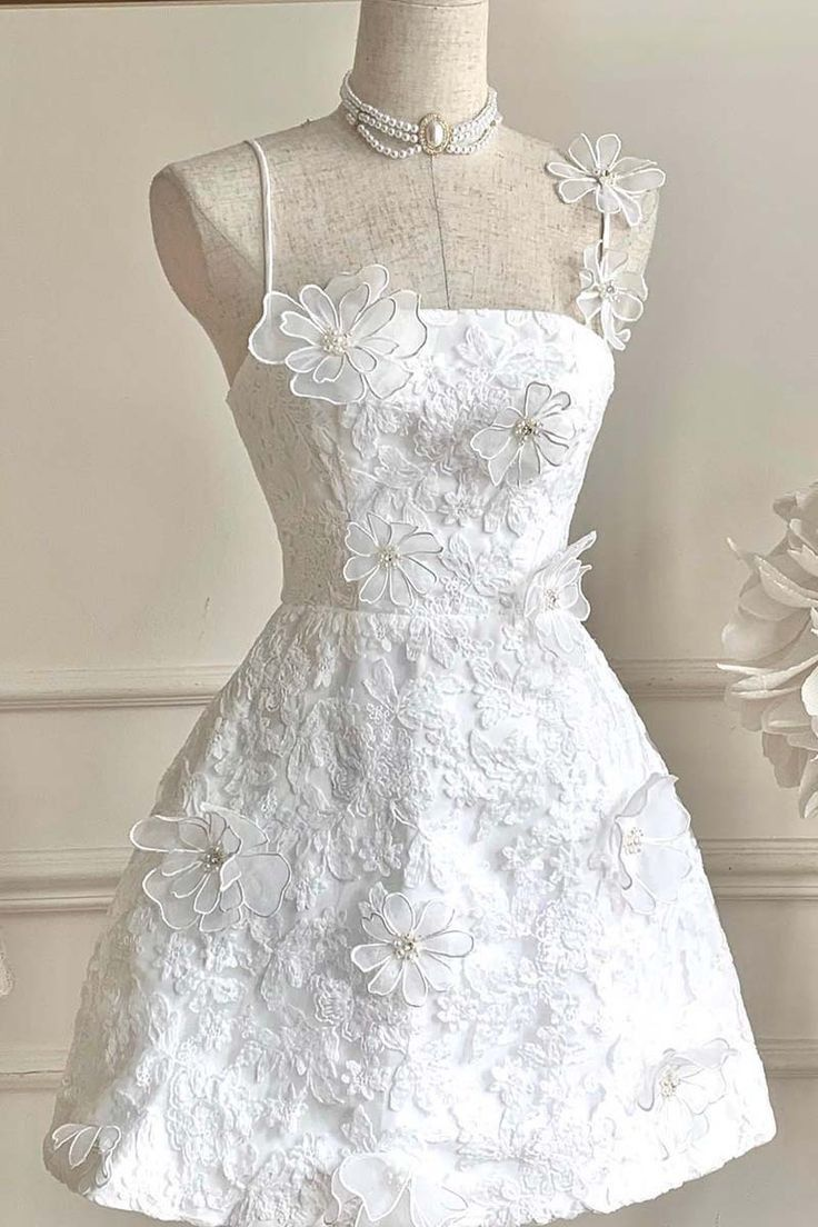 Pretty White Spaghetti Straps Lace A Line Short Homecoming Dress Birthday Outfits With Flowers SP202