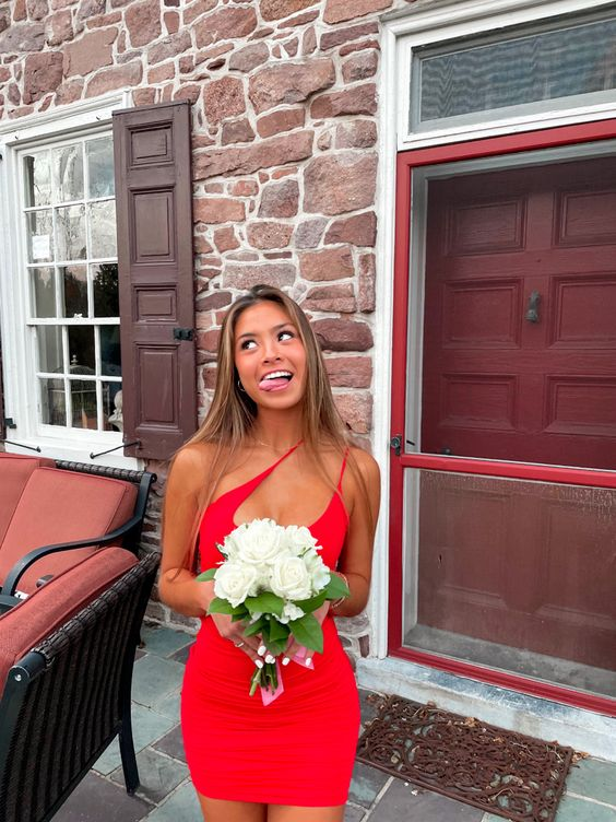 Red irregular neckline homecoming dress,bodycon dress Y2762