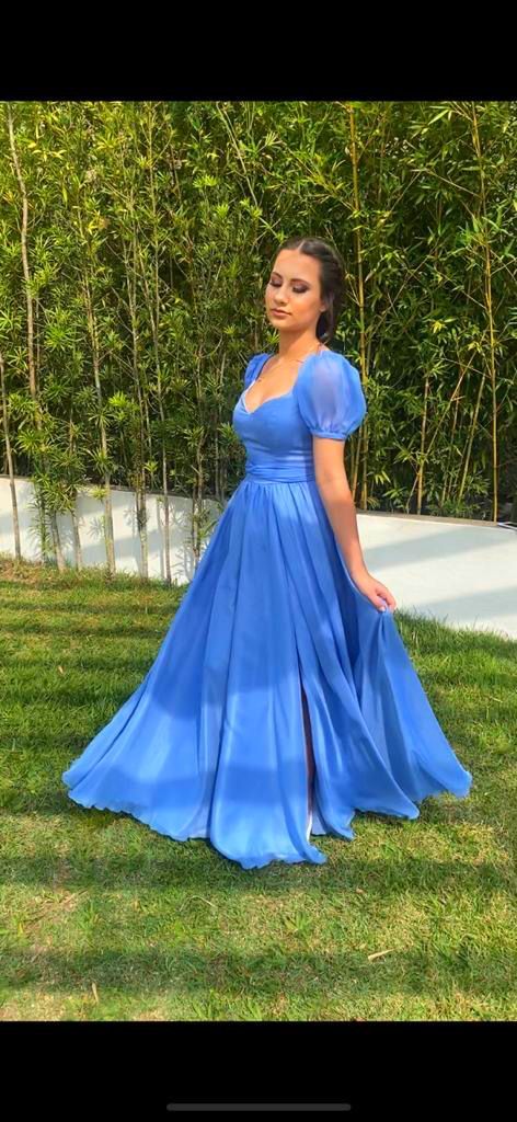 Retro A-line Blue Prom Dress with Puffy Sleeves,Backless Prom Gown Y4300