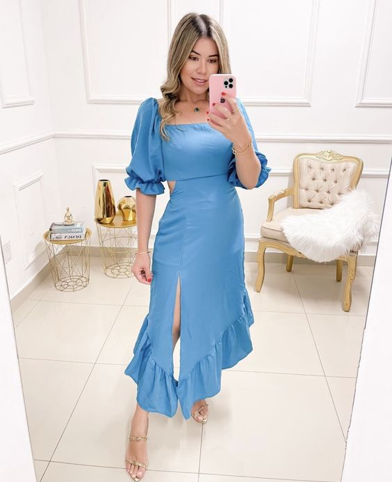 Retro Style Blue Square Neckline Prom Dress With Split Y6167