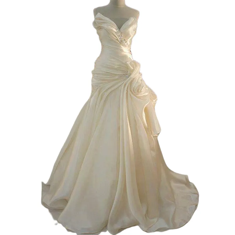 Ruffles Cream Satin Wedding Dress with Beadings Elegant Long Bridal Dress Y4136