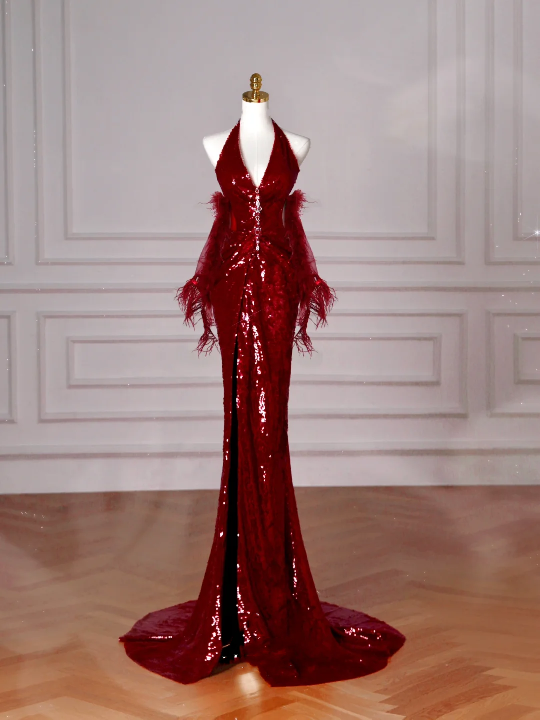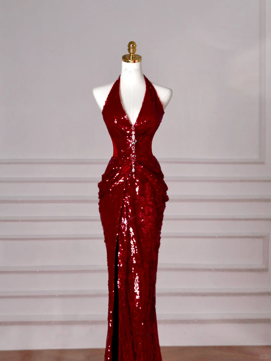 Sexy Burgundy Sequins Halter V Neck Evening Dress,Backless Mermaid Evening Dress Y8628