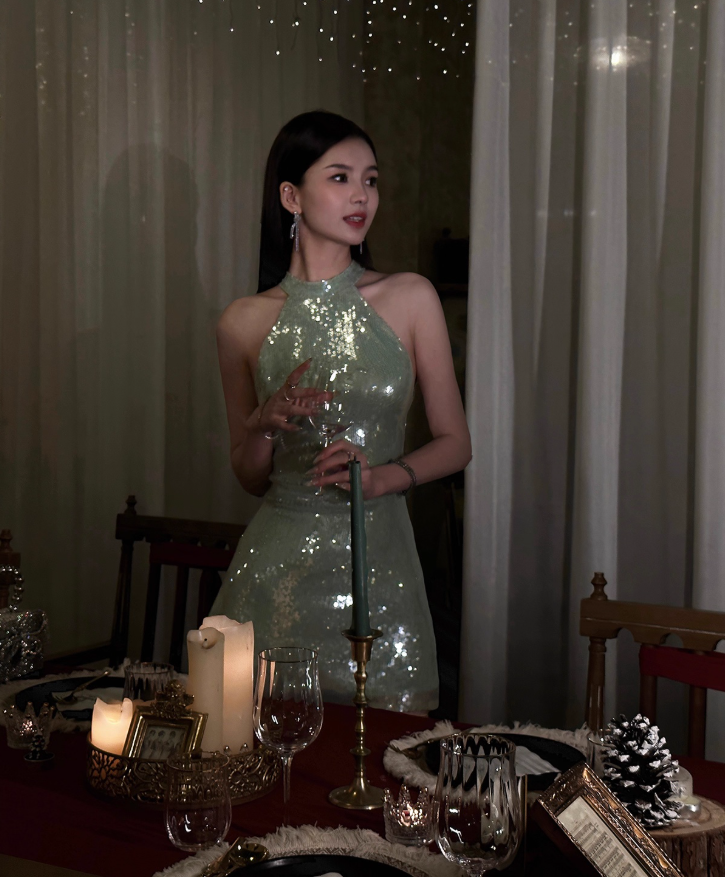 Sexy Halter Mint Green Sequin Sheath Cocktail Dress Birthday Outfits Formal Homecoming Dress Y9361