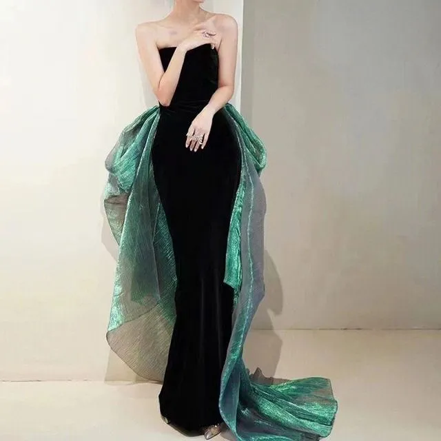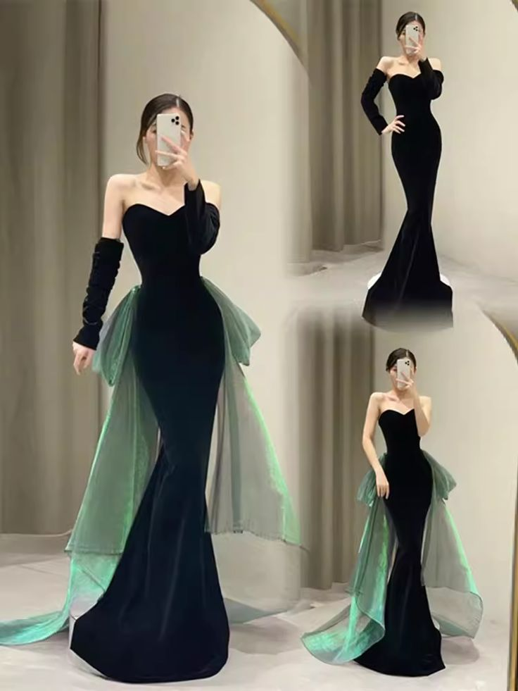 Sexy Mermaid Long Black Velvet Prom Dresses Long Prom Gown With Gloves Y7286