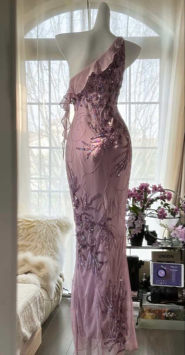 Sexy Purple Beaded Chiffon Prom Dress,One Shoulder Sheath Evening Dress Y8759
