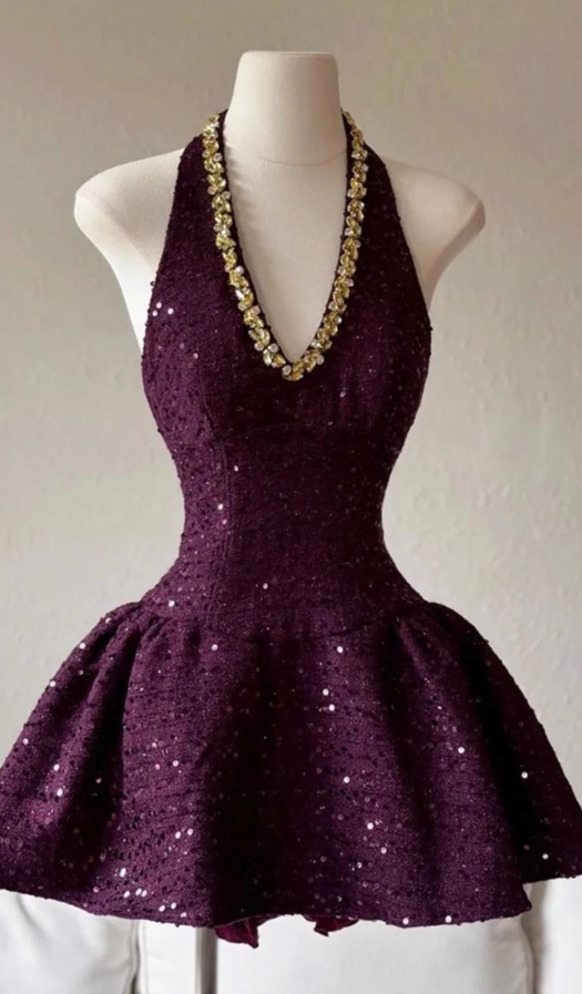 Sexy Purple Halter Sequin Beaded A Line Cocktail Dress V Neck Short Homecoming Dress Y9240