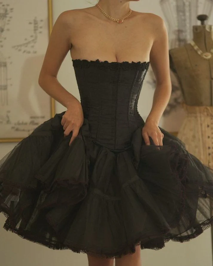Sexy Strapless Black Tulle Lace A Line Homecoming Dress Short Party Dress Cocktail Dress Y8857
