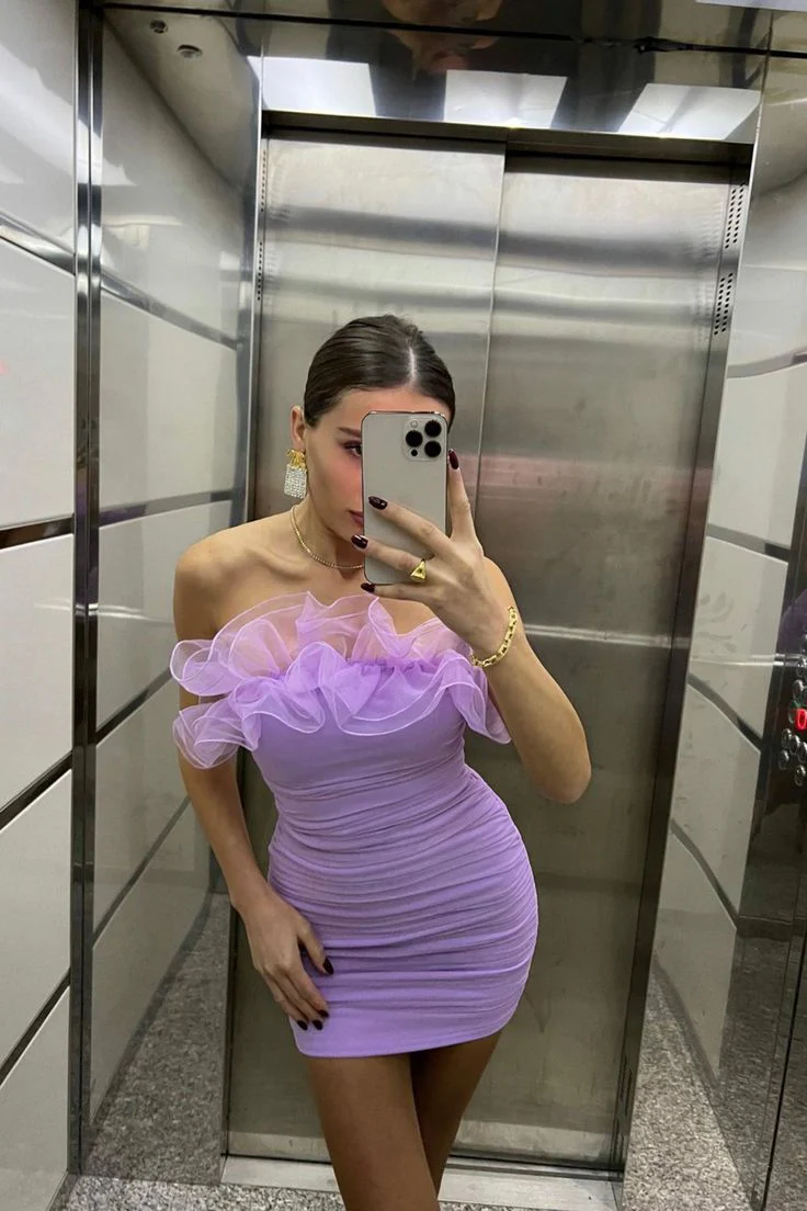 Sexy Strapless Ruffle Tulle Satin Sheath Cocktail Dress Lavender Formal Homecoming Dress Y9889