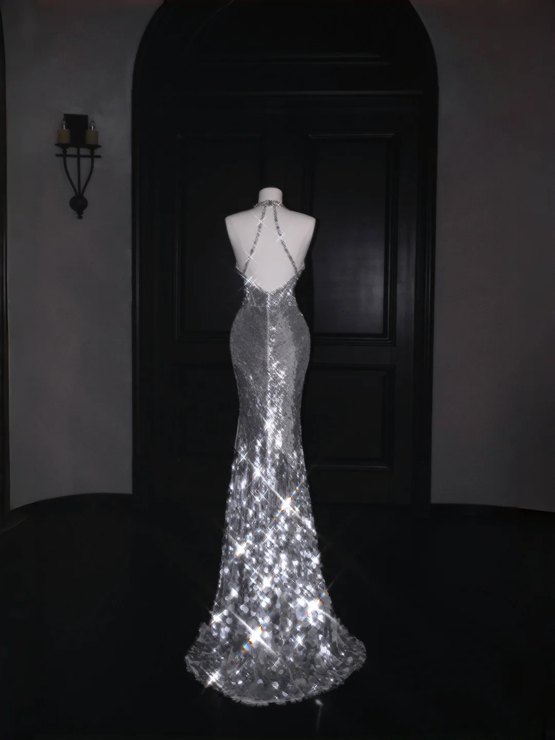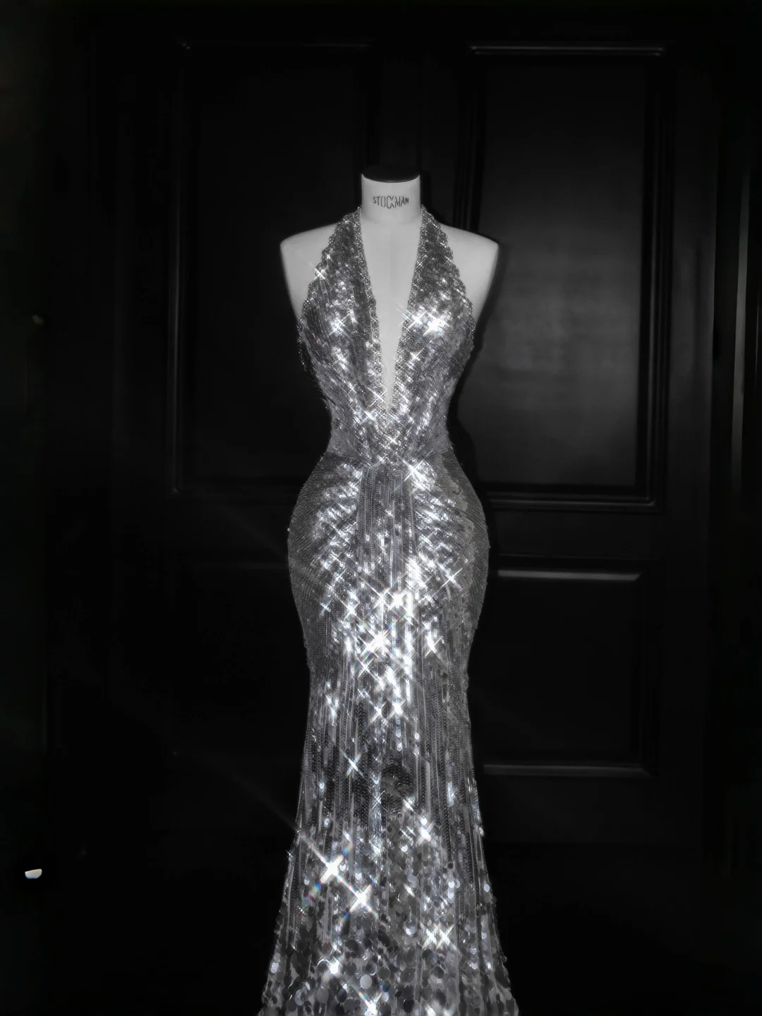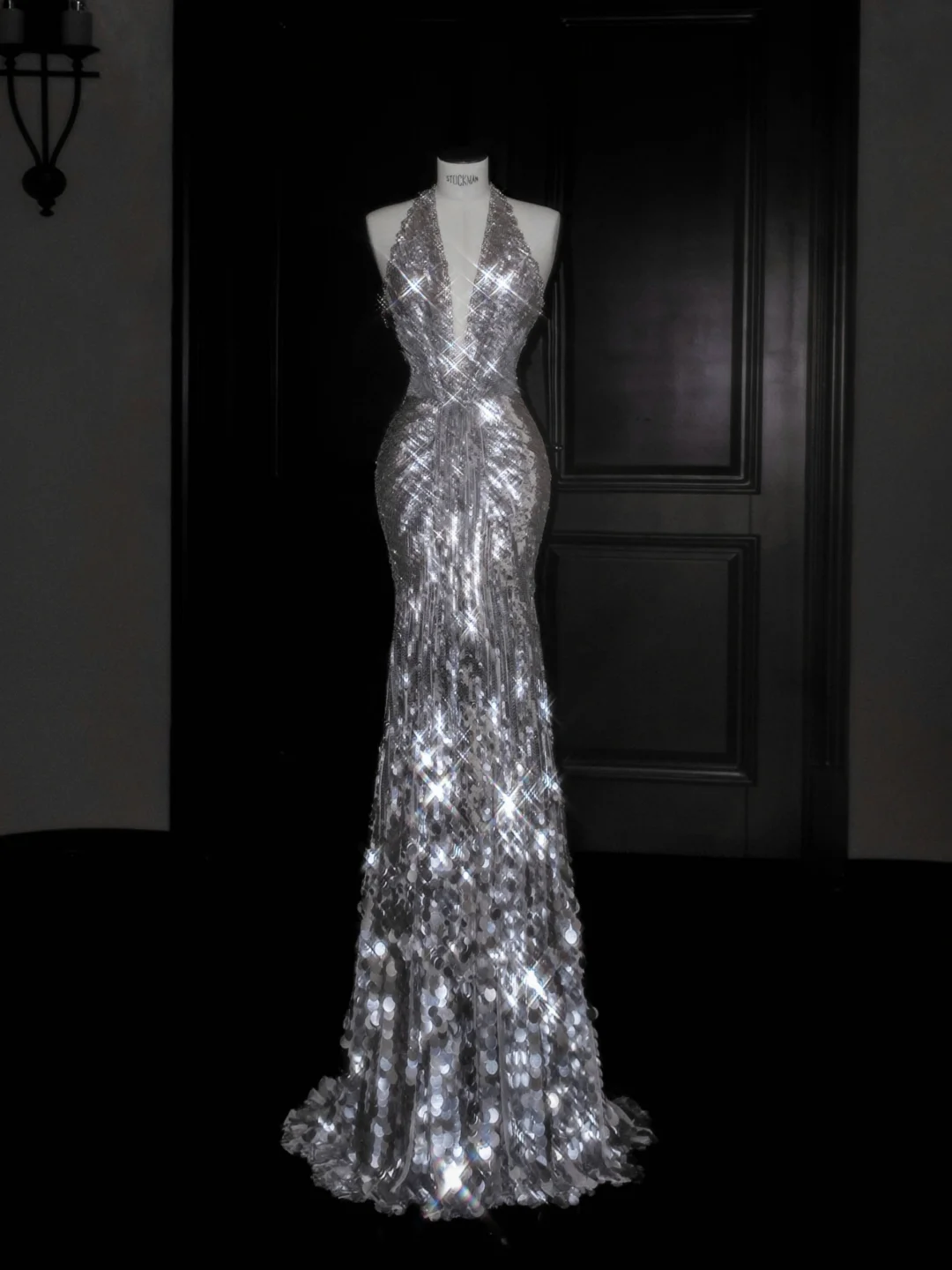Sparkly Silver Deep V Halter Sequins Beaded Backless Evening Dress,Mermaid Prom Dress Y8687
