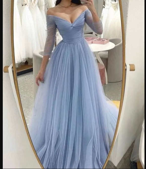 Simple blue tulle long prom dress blue tulle formal dress Y6217