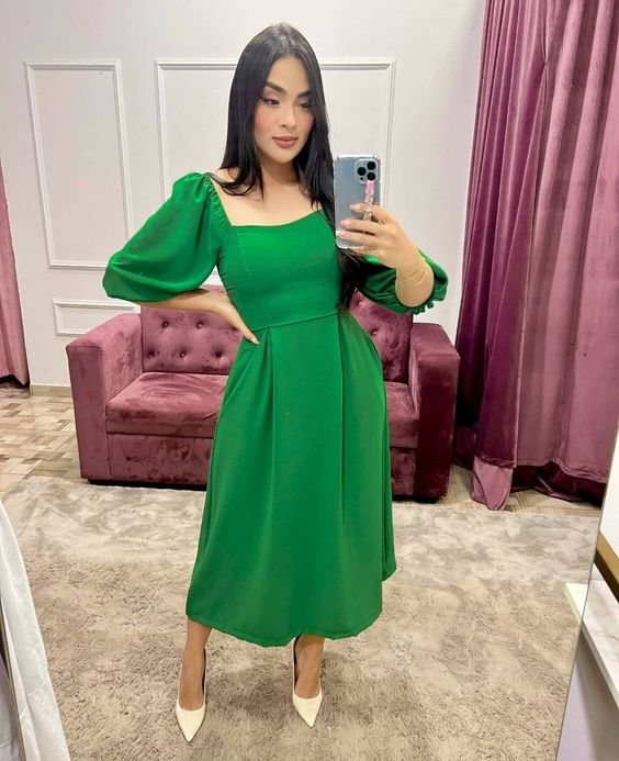 Simple Green Puff Sleeves Prom Dress,Green Party Gown Y5966